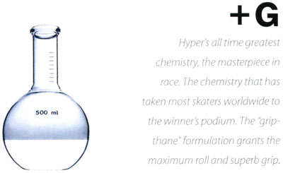Dosud nepřekonaná technologie Hyper nyní již nejen v rychlobruslení, tato kola mají vynikající poměr rychlosti, odraznosti a přinášejí vynikající přilnavost pro vnitřní i venkovní použití, není neobvyklé, že nejlepší jezdci světa jezdí právě na kolečkách Hyper postavené na technologii s přívlastkem + G. Obecně lze říci, že na rozdíl od předchozí varianty koleček + R tato přináší více důraz na stabilitu a kontrolovatelnost, v rychlobruslení se používá například pro hrubé sjezdy z kopců (downhill) kde jsou rychlosti tak veliké, že je potřeba perfektní přilnavosti a ovladatelnosti. Dále ve vnitřním provedení (méně než 76A) se tato směs používá především v halách kde je opět potřeba, aby jezdec v zatáčkách „neujížděl“ ale i v prudkém náklonu udržel svou rychlost. Tato směs se čím dál více objevuje i v tréninkovém provedení, nebo je implementována do mnoha Fitness a Urban-Freestyle variant kol, kde výrazně doplňuje jejich vlastnosti. Tato technologie vám i při obyčejné fitness jízdě v parku zajistí, že se můžete „virtuálně“ naklonit v zatáčce jako to dělají jezdci na závodních motocyklech (pokud ovšem na cestě není písek, trramtadadááá). Tato směs je obsažena v obou typech profilů kol jak špičatém (Narow) tak více kulatém (Wide)